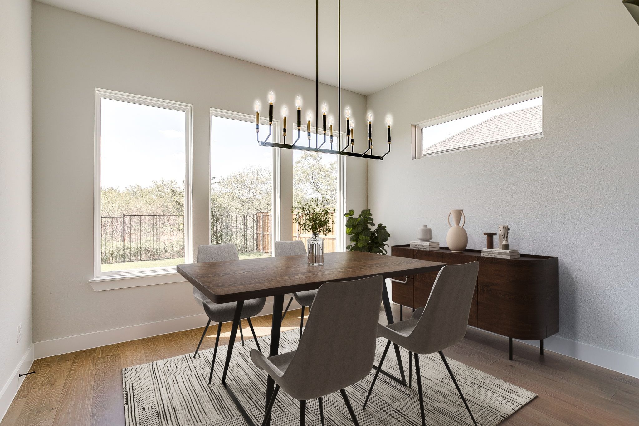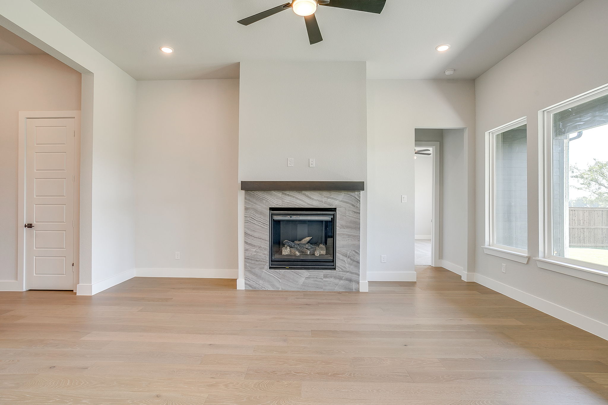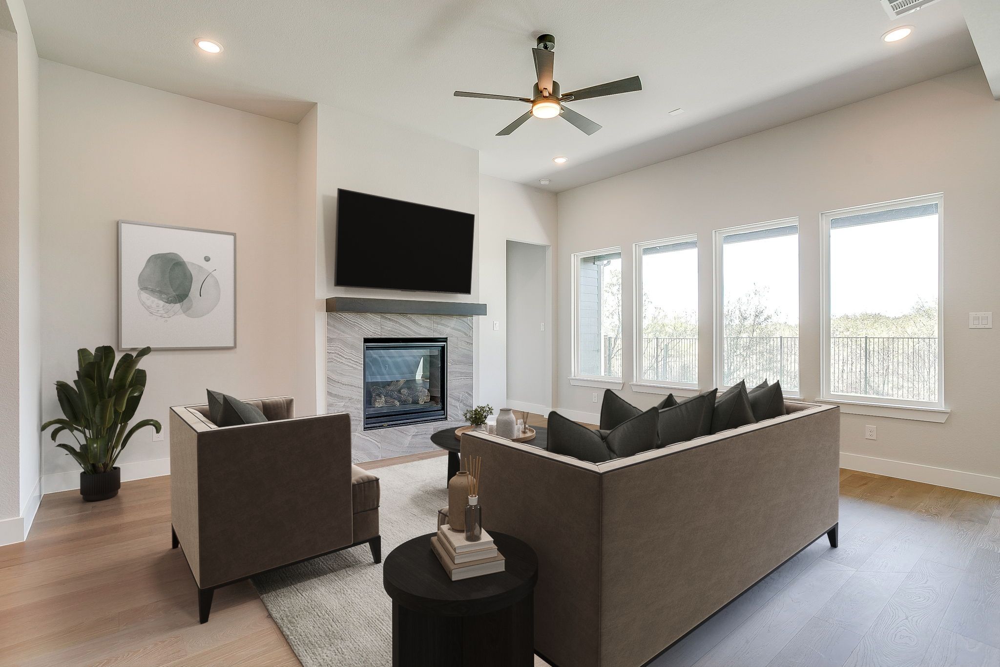 Experience effortless luxury in this thoughtfully designed 2,245 sq. ft. single-story home featuring 4 spacious bedrooms, 2 elegant baths, and a spa-inspired primary suite with a freestanding tub. Nestled on a serene greenbelt lot, this home boasts a gas starter fireplace, custom mud locker, and a covered patio with a natural gas stub—perfect for seamless indoor-outdoor living.